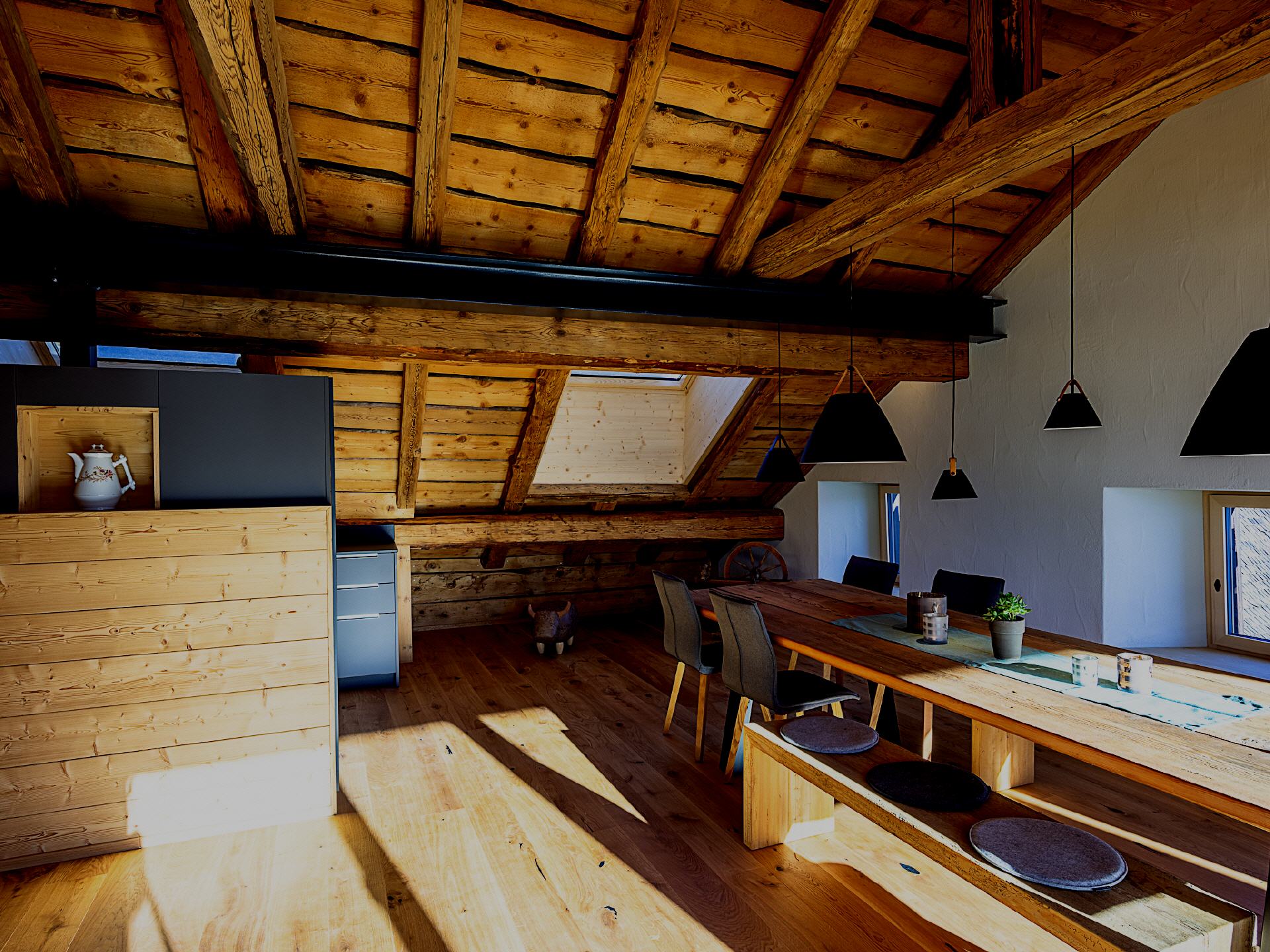 Der Wohnbereich liegt im alten, aufgerüsteten Dachstuhl und macht die Abende im Kreise der Familie oder mit Freunden besonders gemütlich. Von der neuen Dachterrasse hat man einen schönen Weitblick über das Dorf in die Süd Täler. Das Gebäude kommt innen in einem neuen modernen Look daher bei dem aber die alten Holzelemente bewusst belassen, aufgerüstet und wiederverwendet wurden. Entstanden ist ein Haus mit viel Charakter.